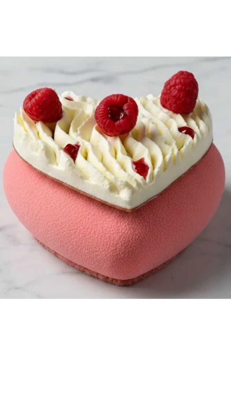 Speak LOVE with this heart shaped raspberry mousse entremet cake covered with white chocolate velvet for the ultra chic gift for any occasion.